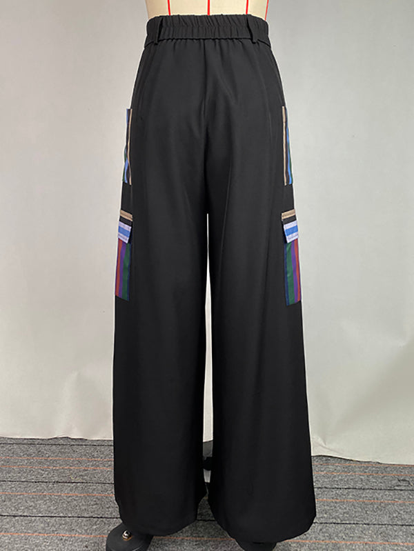 High Waisted Loose Pockets Split-Joint Striped Pants Trousers
