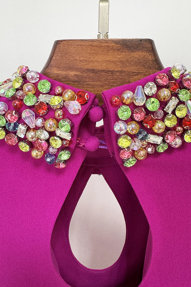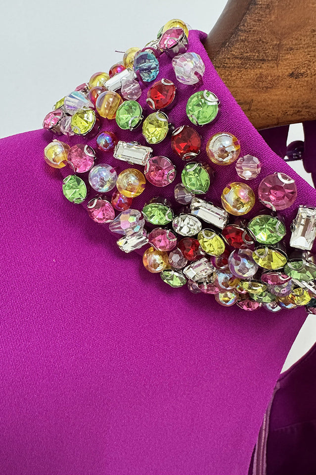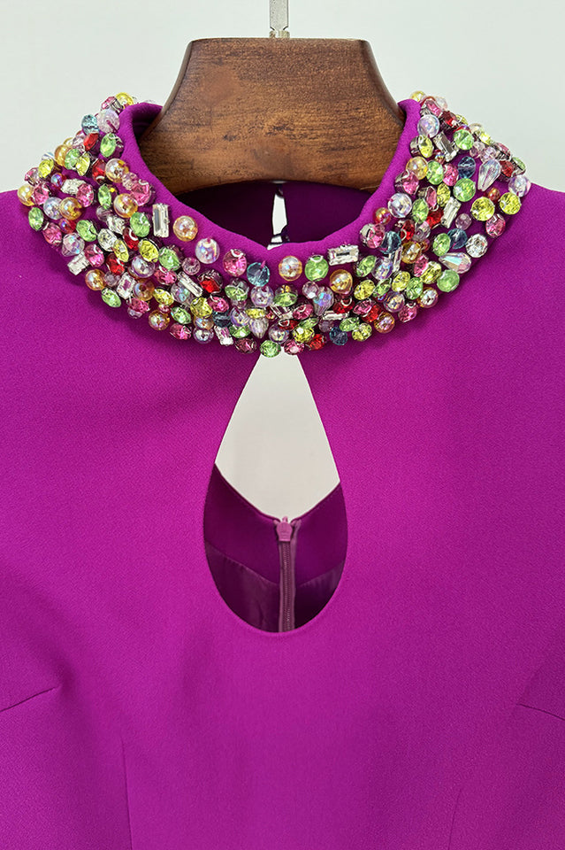 Mock Neck, Long Split Sleeves, Keyhole Detailing, Bead & Crystal Embellishment, Mermaid Hem, Maxi Length.
