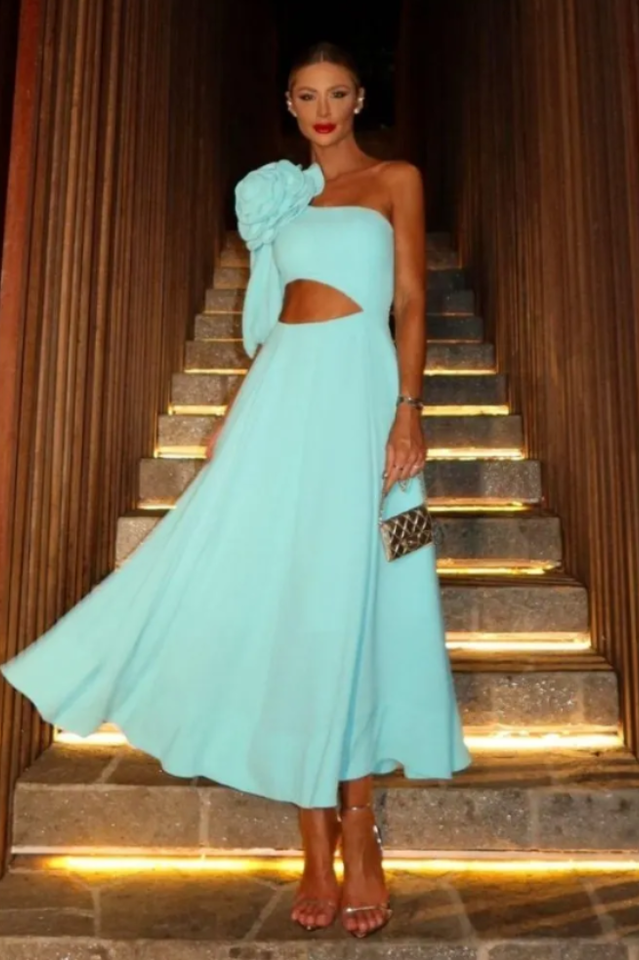 Cut-out Detailing, 3D Flower Decored, One-Shoulder, Half Sleeve, Midi Length.