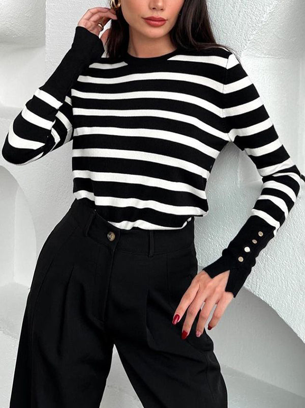 Long Sleeves Buttoned Contrast Color Striped Round-Neck Sweater Tops
