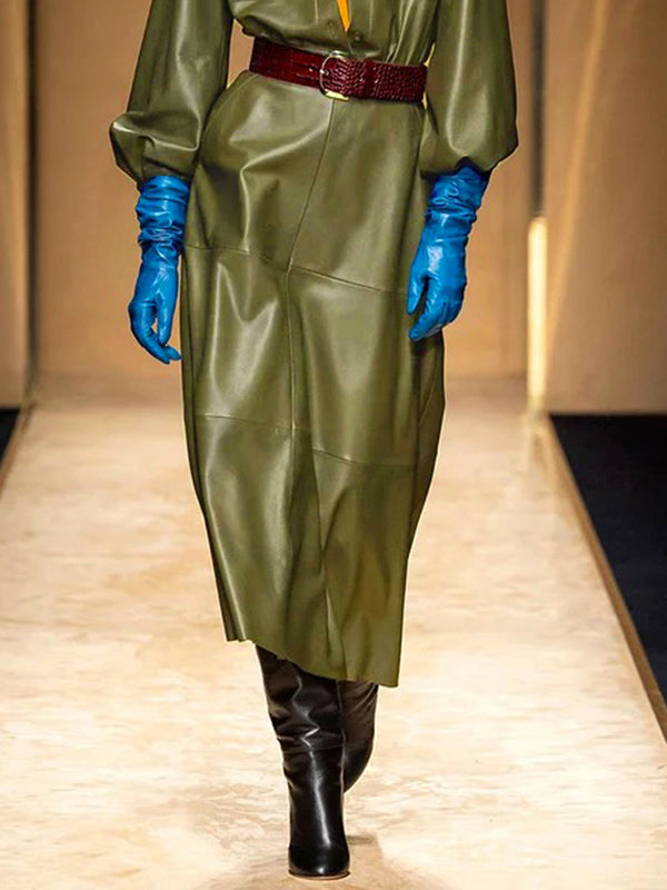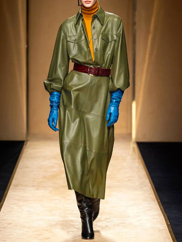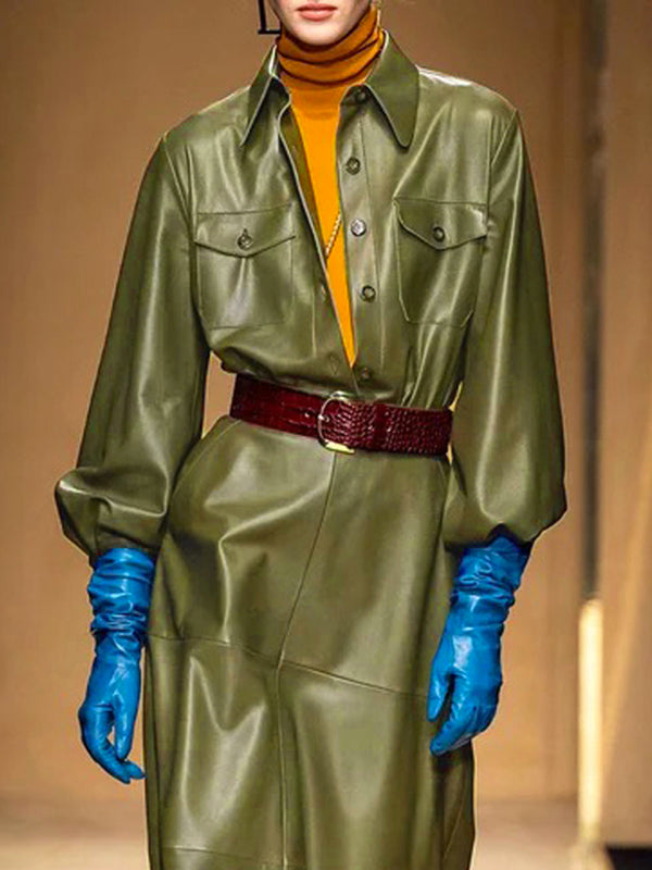 Long Sleeves Loose Buttoned No Belt Pockets Solid Color Split-Joint Lapel Midi Dresses