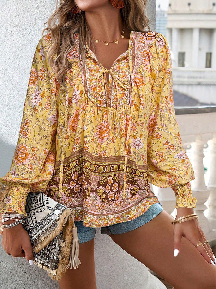 Long Sleeves Loose Contrast Color Drawstring Flower Print Pleated Split-Joint V-Neck Blouses&Shirts Tops
