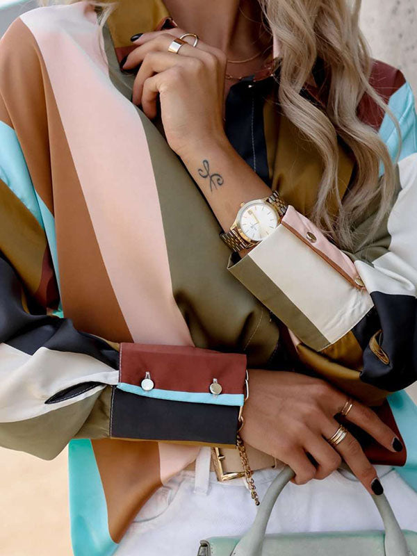 Long Sleeves Loose Contrast Color Printed Lapel Blouses