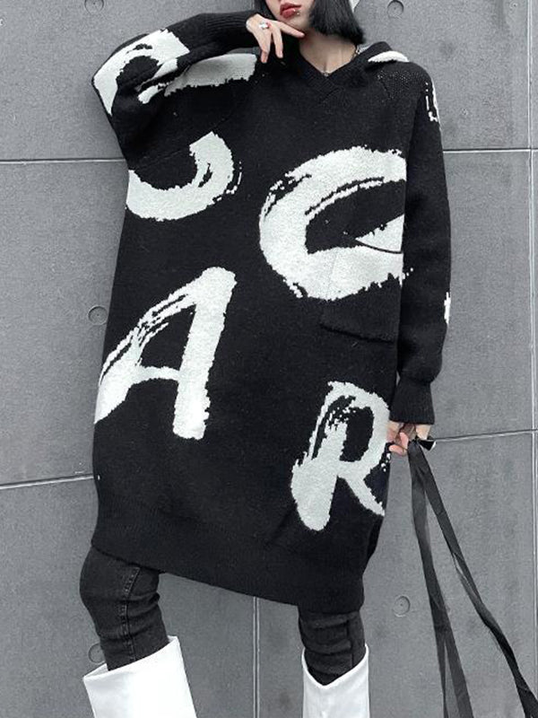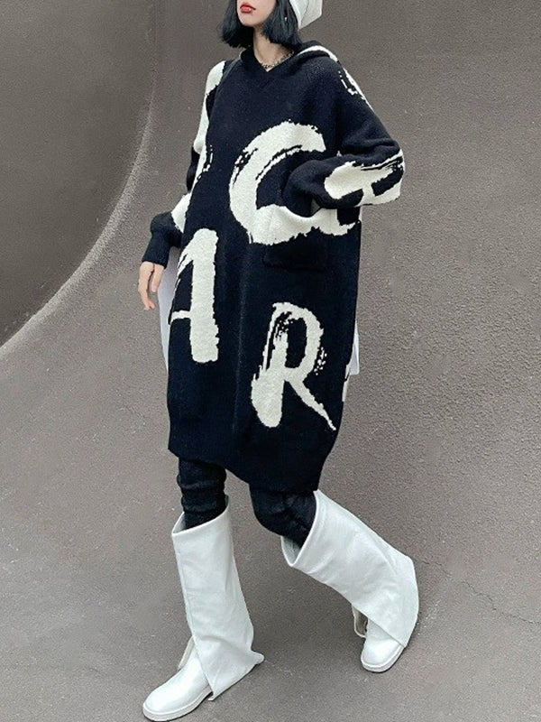 Long Sleeves Loose Knitted Letters Pockets Hooded Mini Dresses Sweater Dresses