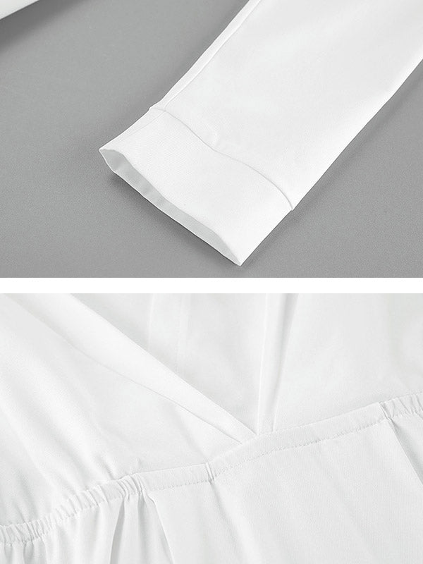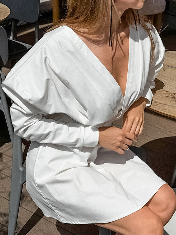 Long Sleeves Loose Pleated Solid Color Split-Joint Tied Waist V-Neck Mini Dresses Shirt Dress