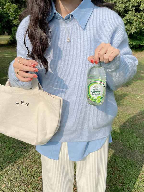 Long Sleeves Loose Solid Color Round-Neck Pullovers Sweater Tops