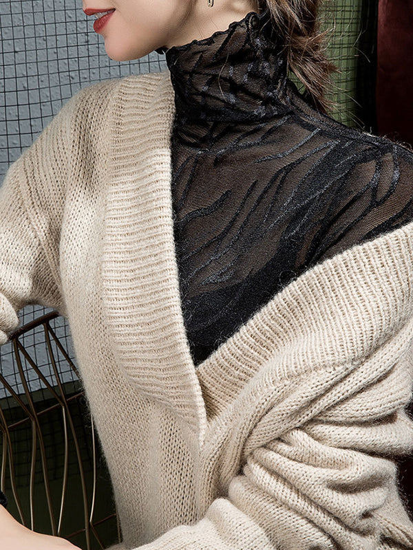 Long Sleeves Plus Size See-Through Solid Color High Neck T-Shirts Tops