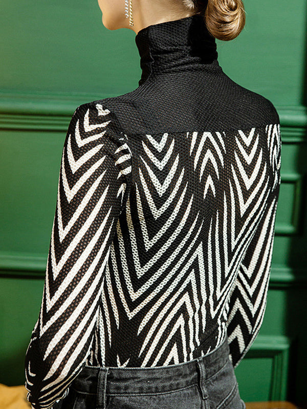 Long Sleeves Plus Size See-Through Split-Joint High Neck T-Shirts