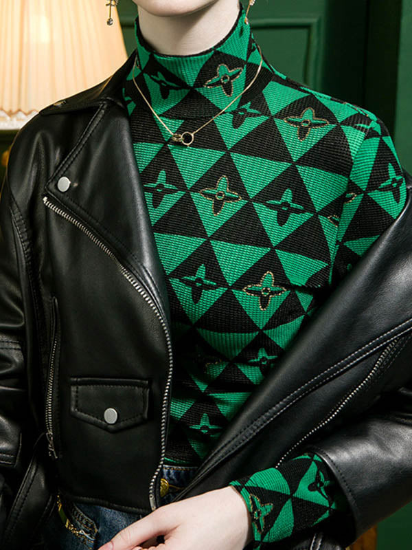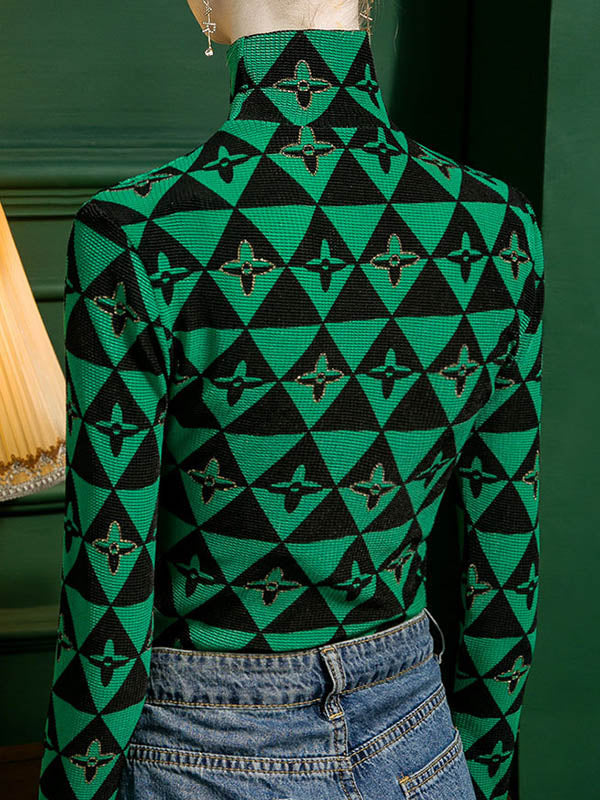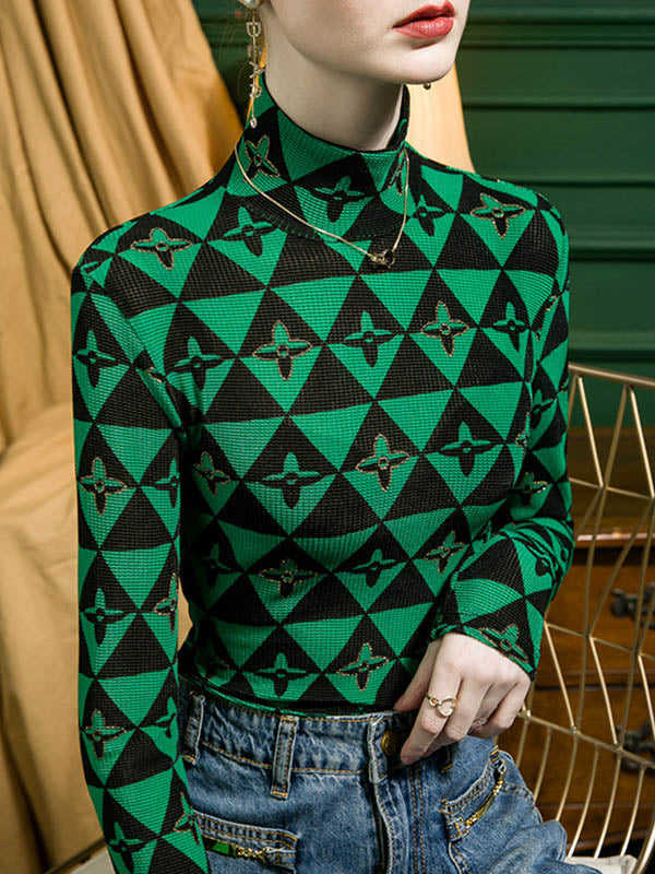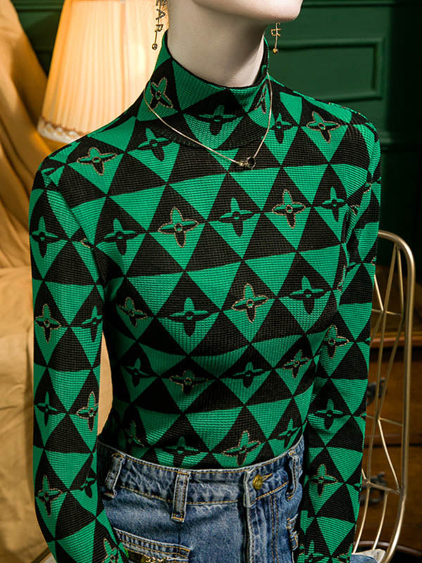 Long Sleeves Skinny Bronzing Contrast Color High Neck T-Shirts Tops