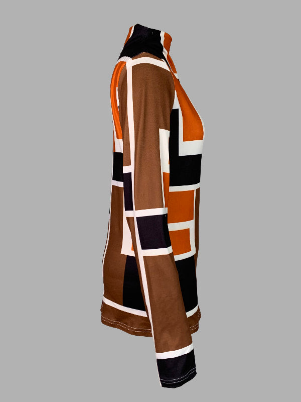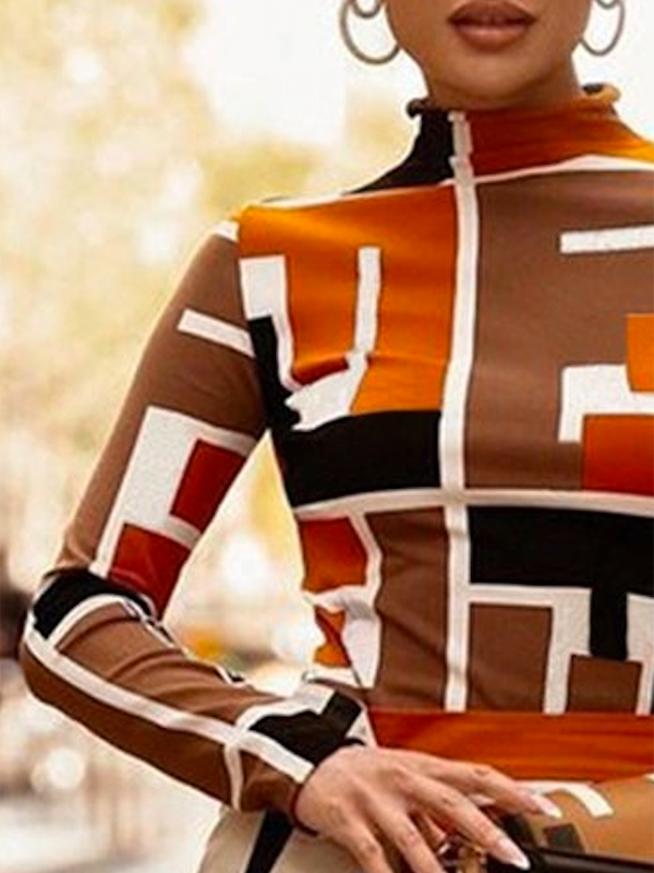 Long Sleeves Skinny Geometric Printed High Neck T-Shirts Tops