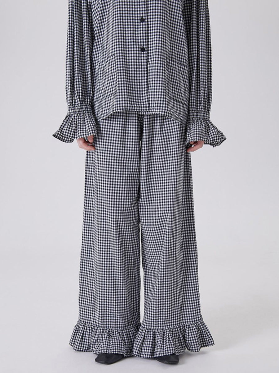 Loose Contrast Color Plaid Ruffled Split-Joint Long Sleeves Buttoned Lapel Blouses&Shirts Tops + Pants Two Pieces Set