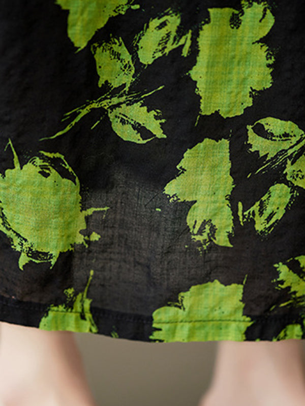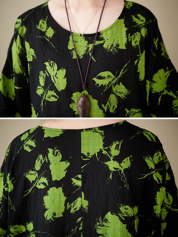 Loose Floral Pleated Round-Neck Midi Dresses