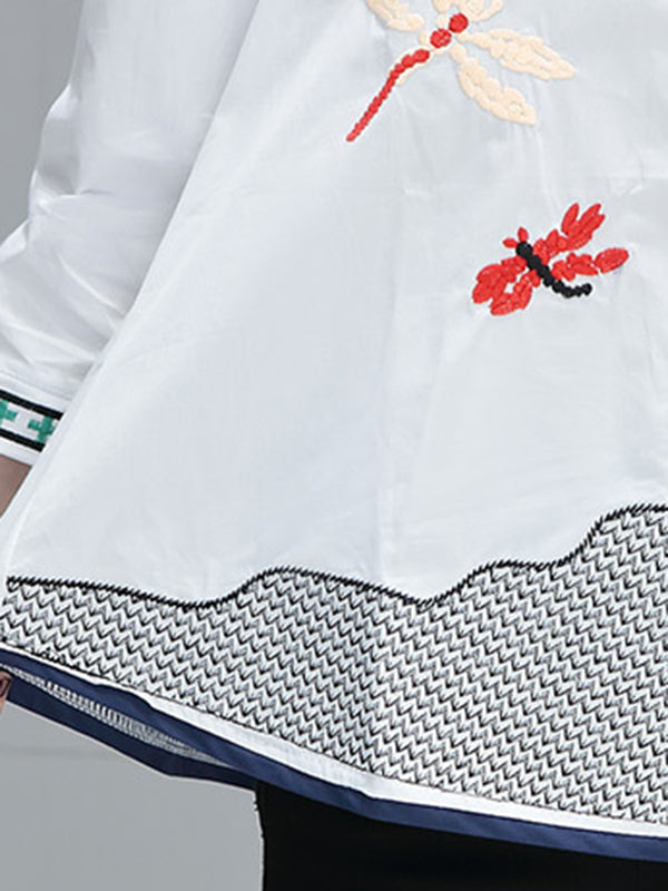 Loose Plus Size Embroidered Figure Stand Collar Blouses&Shirts Tops