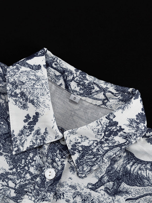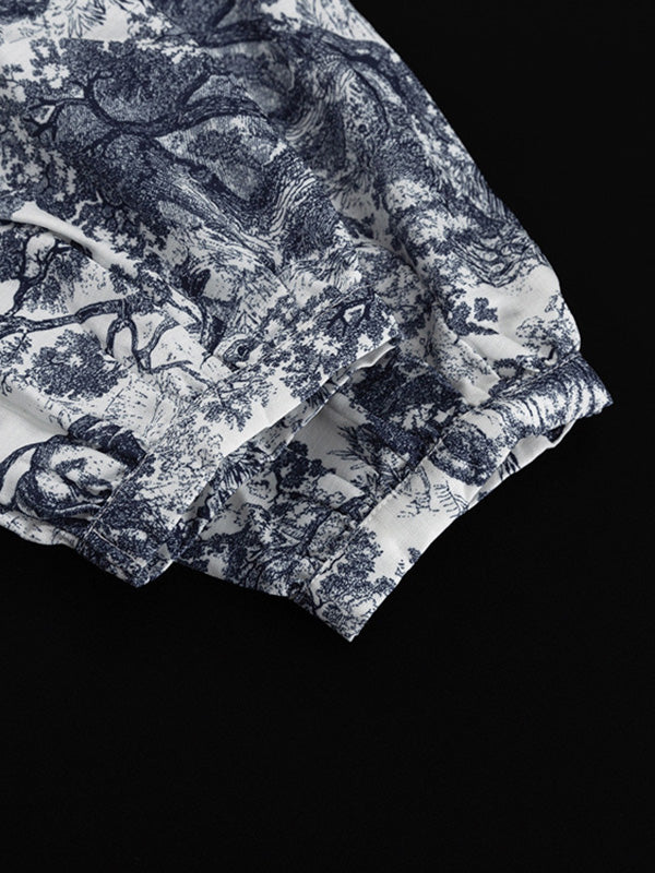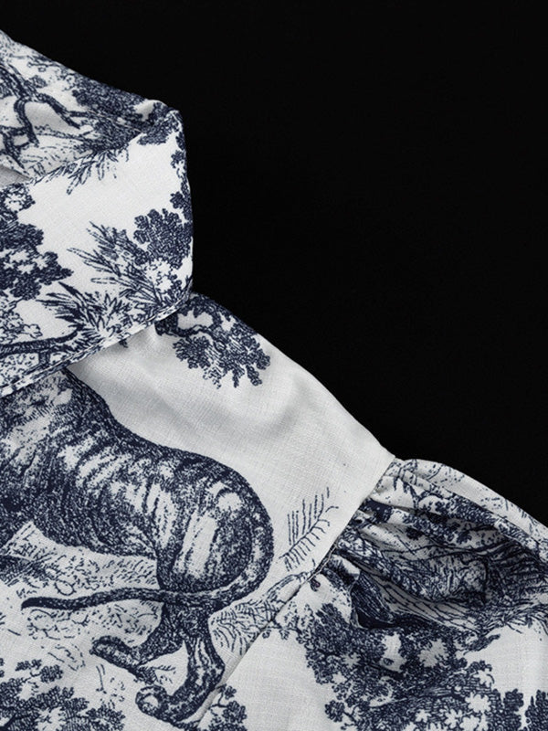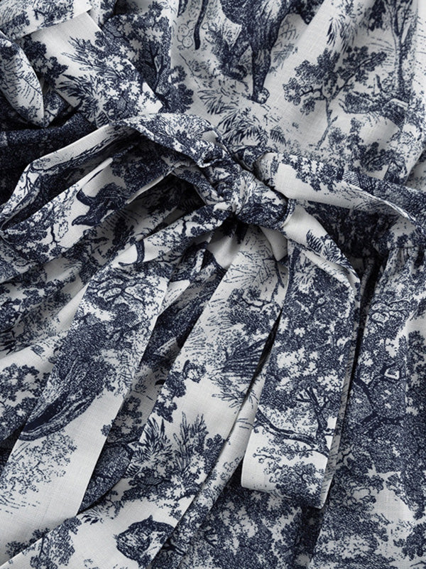 Loose Puff Sleeves Pleated Printed Split-Joint Tied Waist Lapel Mini Dresses Shirt Dress
