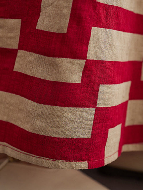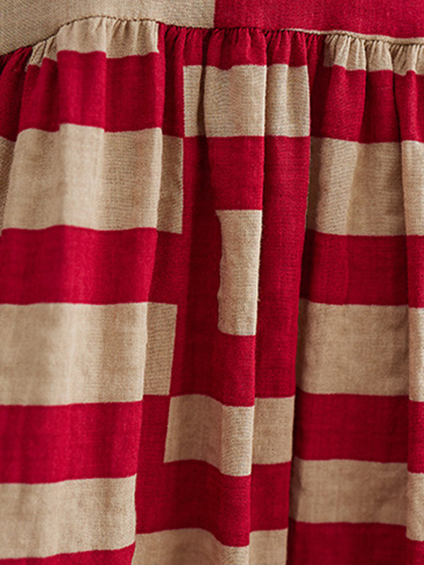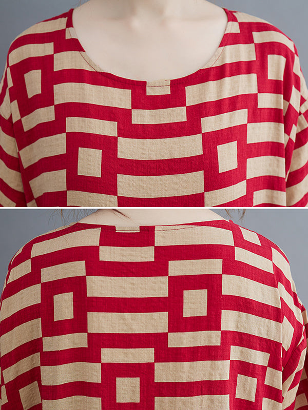 Loose Short Sleeves Plaid Round-Neck Midi Dresses