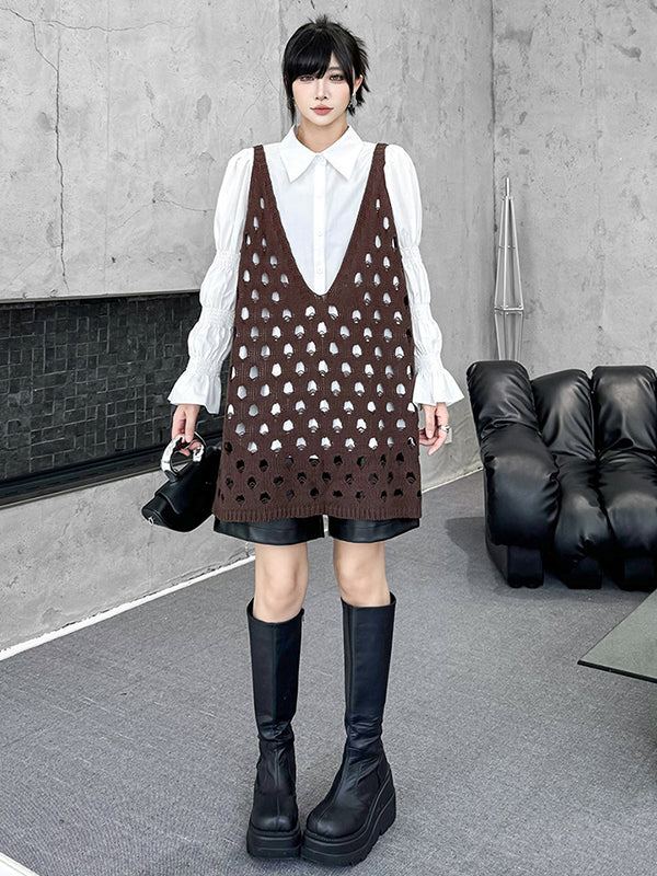 Loose Sleeveless Hollow Solid Color V-Neck Vest Top