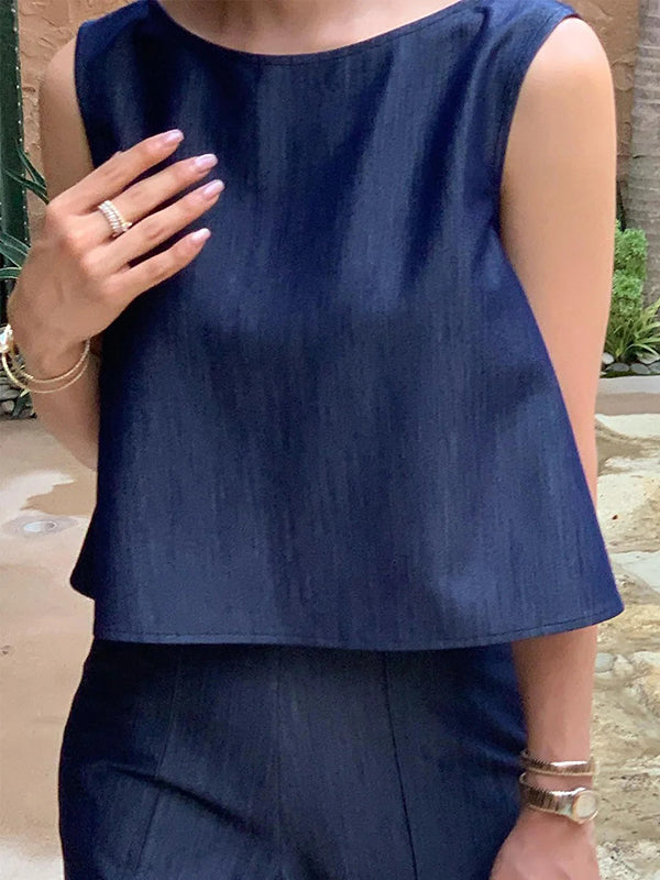 Loose Sleeveless Solid Color Split-Joint Boat Neck Vest Top