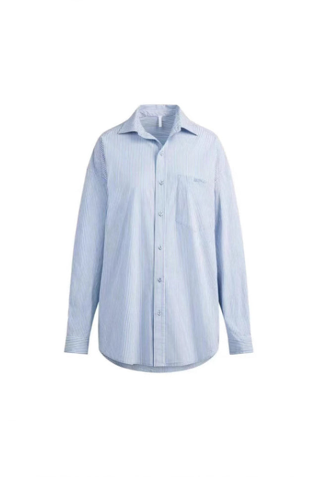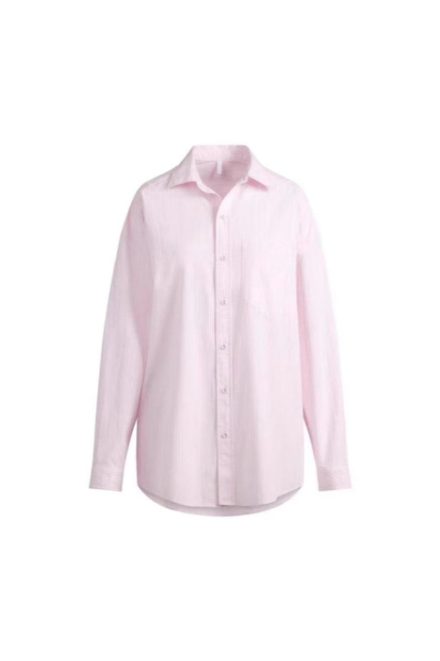 Chic style meets airy comfort in this oversized striped sleep set made with SKIMS signature Cotton Poplin. Includes a long sleeve button-up shirt with an embroidered chest pocket. The pant features a thin elastic waistband with picot trim, front buttons, and side pockets. Fits true to size.