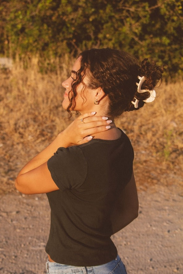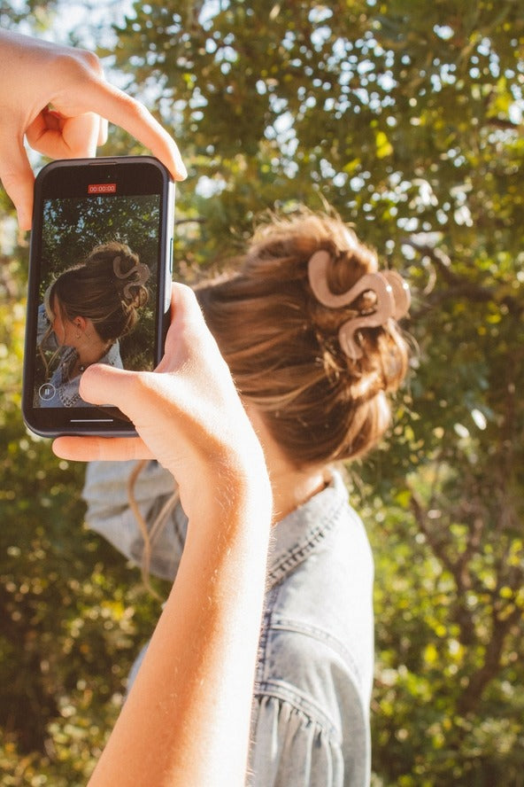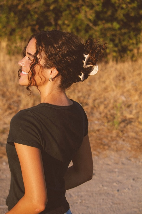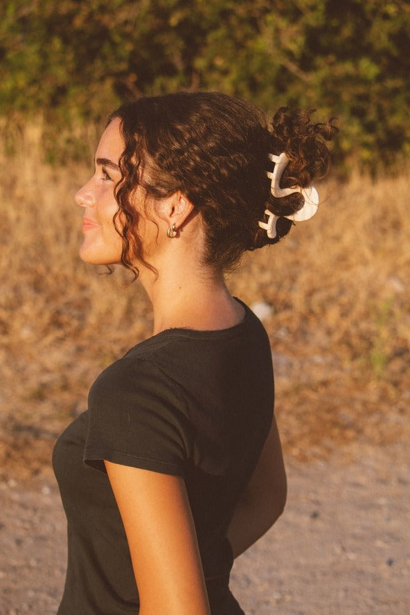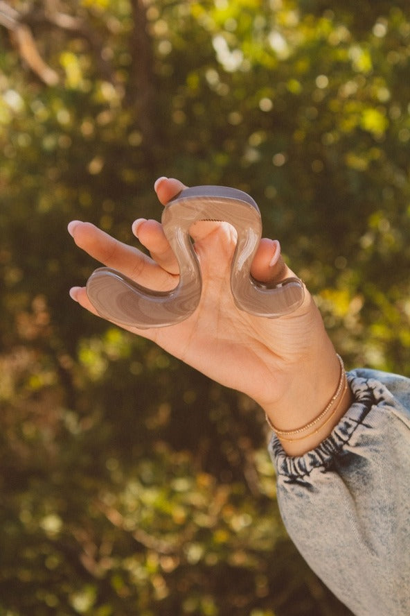 These darling swirl shaped and patterned claw clips are so adorable and versatile. They come in the perfect creamy beige, and a taupe brown made in a high quality acetate material. The best way to elevate your updo for the day. This is a large 4.5 inch claw clip.