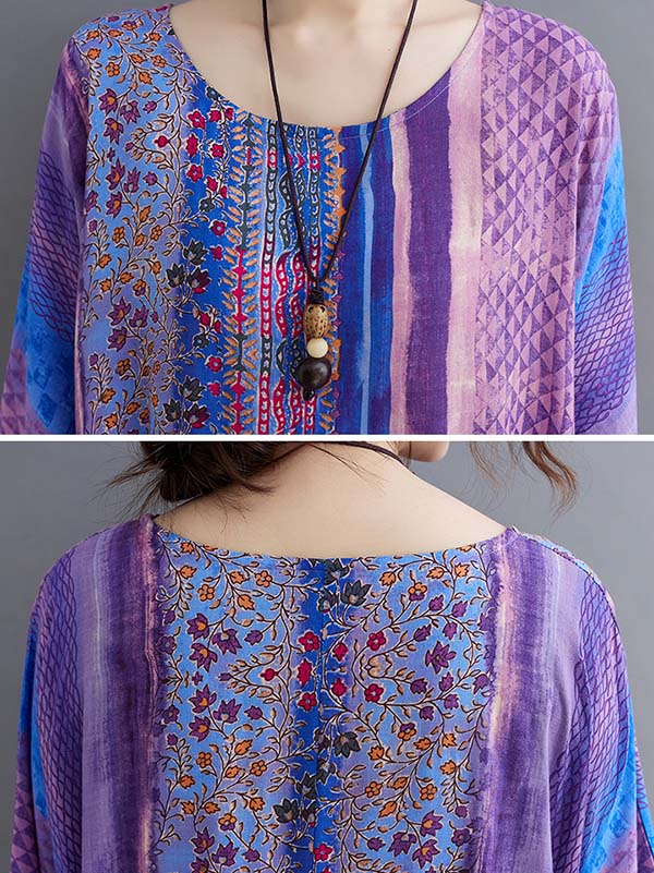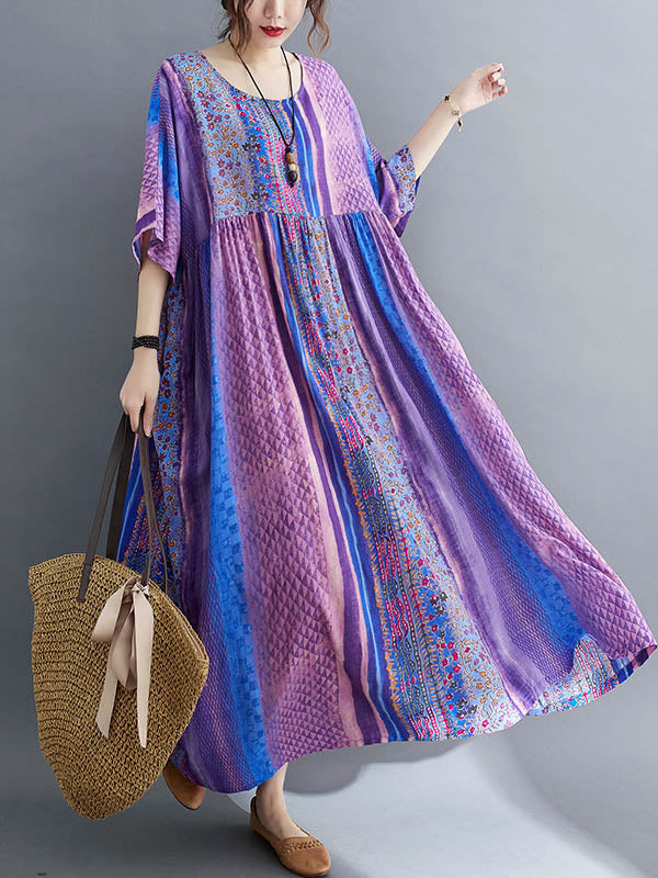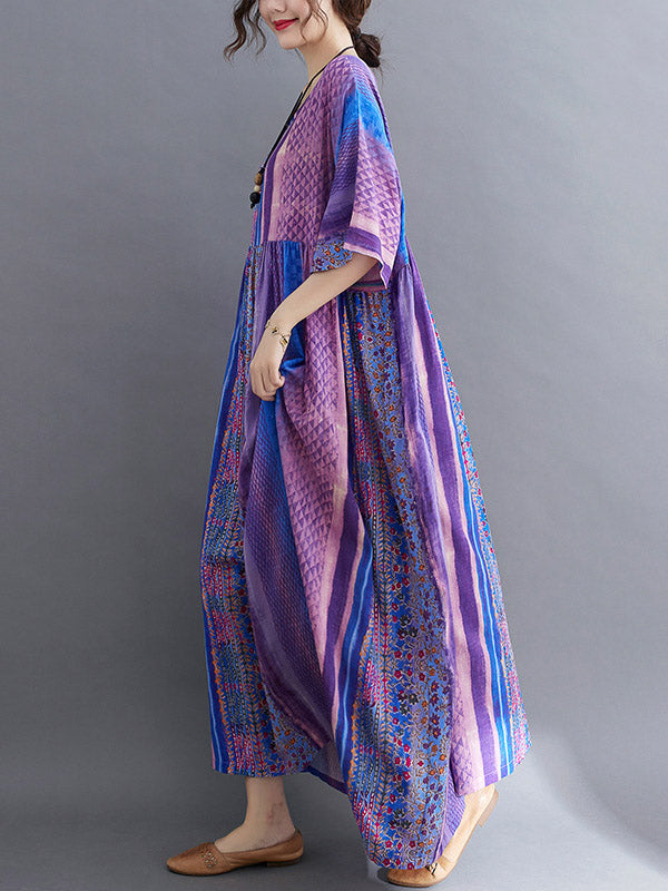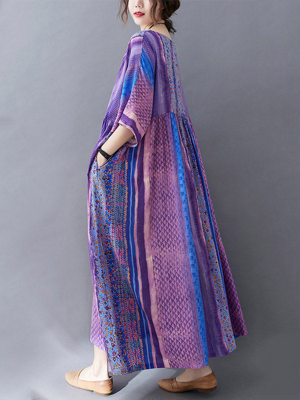 Vintage Side Pocket Striped Floral Printed Midi Dress