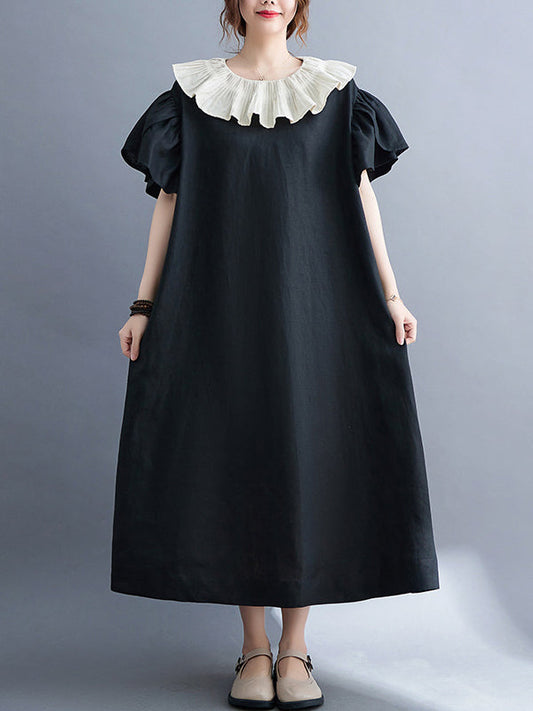 Half Sleeves Loose Applique Solid Color Split-Joint Lapel Collar Midi Dresses