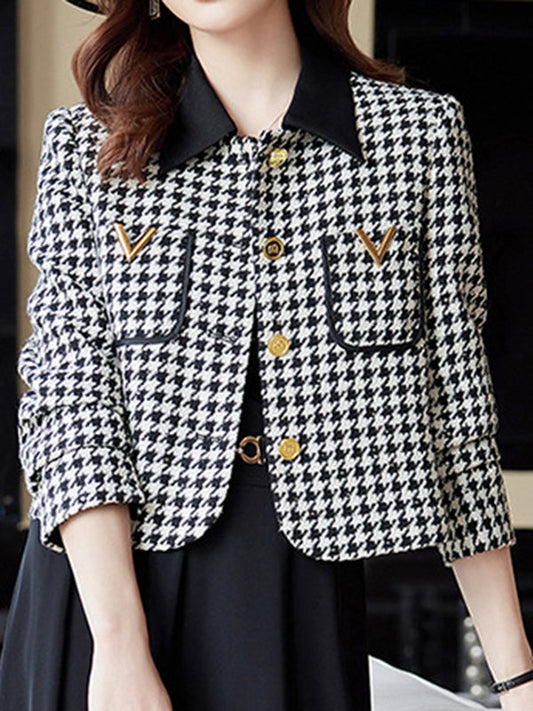 Long Sleeves Plus Size Buttoned Houndstooth Pockets Split-Joint Lapel Outerwear