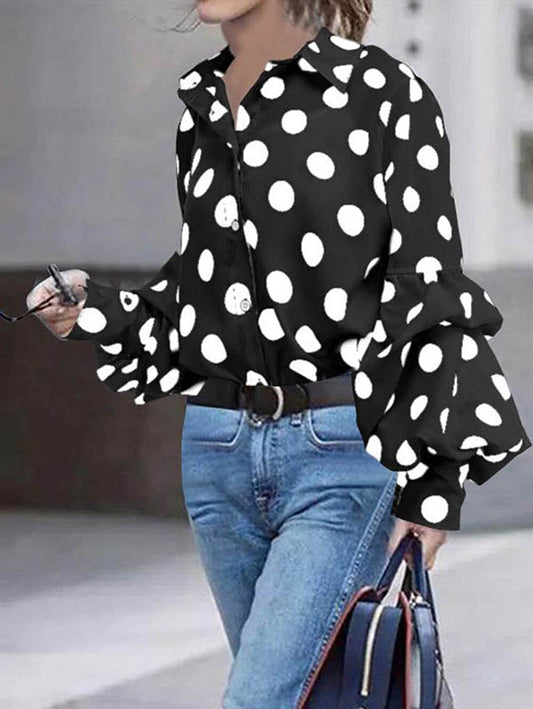 Long Sleeves Loose Buttoned Polka-Dot Split-Joint Lapel Blouses&Shirts Tops