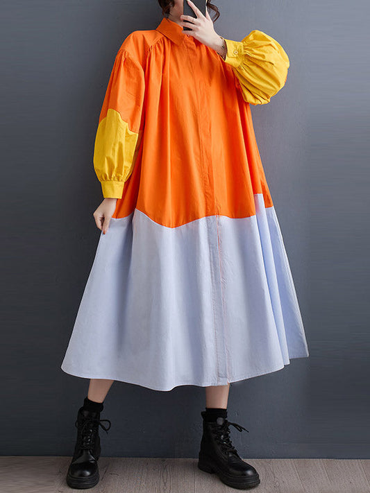 Loose Puff Sleeves Contrast Color Pleated Split-Joint Lapel Midi Dresses Shirt Dress