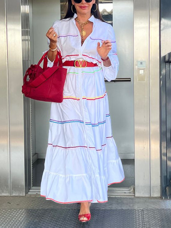A-Line Long Sleeves Buttoned Contrast Color Elasticity Mock Neck Maxi Dresses