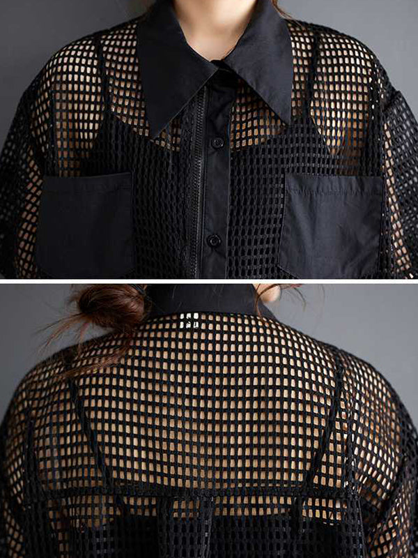 Half Sleeves Loose Hollow Solid Color Split-Joint Zipper Lapel Midi Dresses Shirt Dress