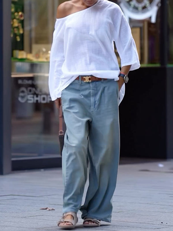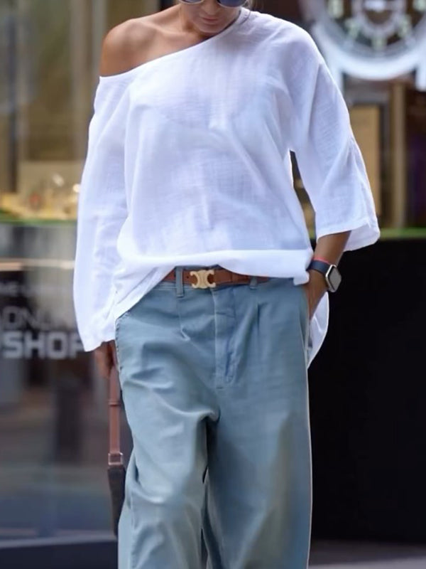 Long Sleeves Loose Solid Color One-Shoulder T-Shirts Tops